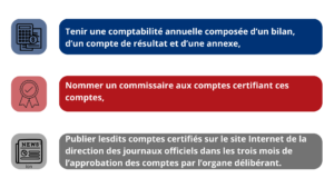 - Obligation de conformité et publicité des comptes : au terme de l’article 612-4 du code de commerce : toute association recevant plus de 153 000 € de subventions ou remplissant deux des trois conditions suivantes (total bilan supérieur à 1 550 000€, chiffre d’affaires supérieur à 3 100 000€, effectif moyen supérieur à 50) doit :