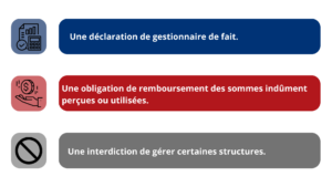 – Une sanction financière (remboursement des sommes gérées illégalement).
